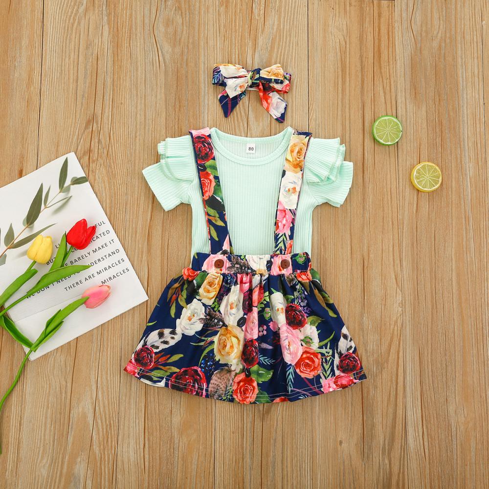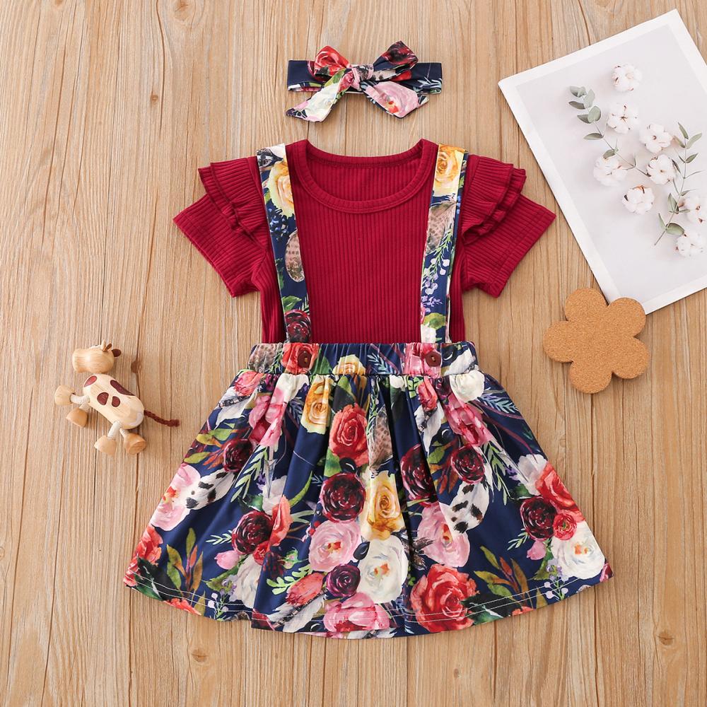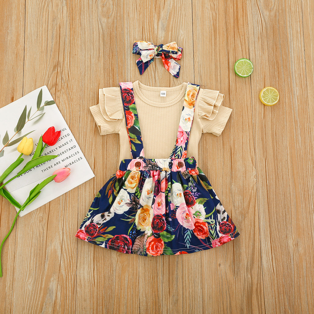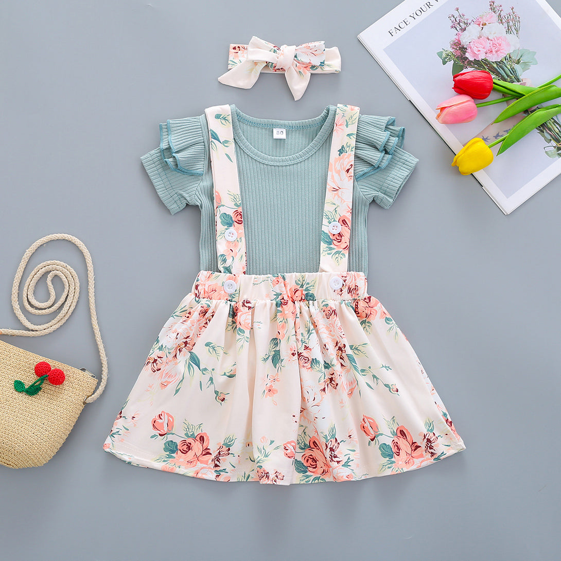 1-5Y Toddler Girls Set Summer Solid Color Pit Strip Top Flower Suspender Skirt And Headband Three-piece Set Wholesale Kids Clothing