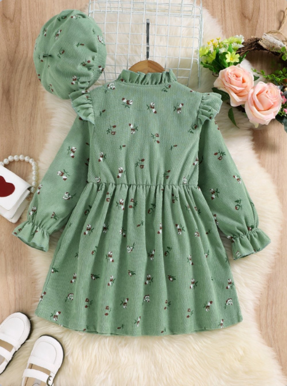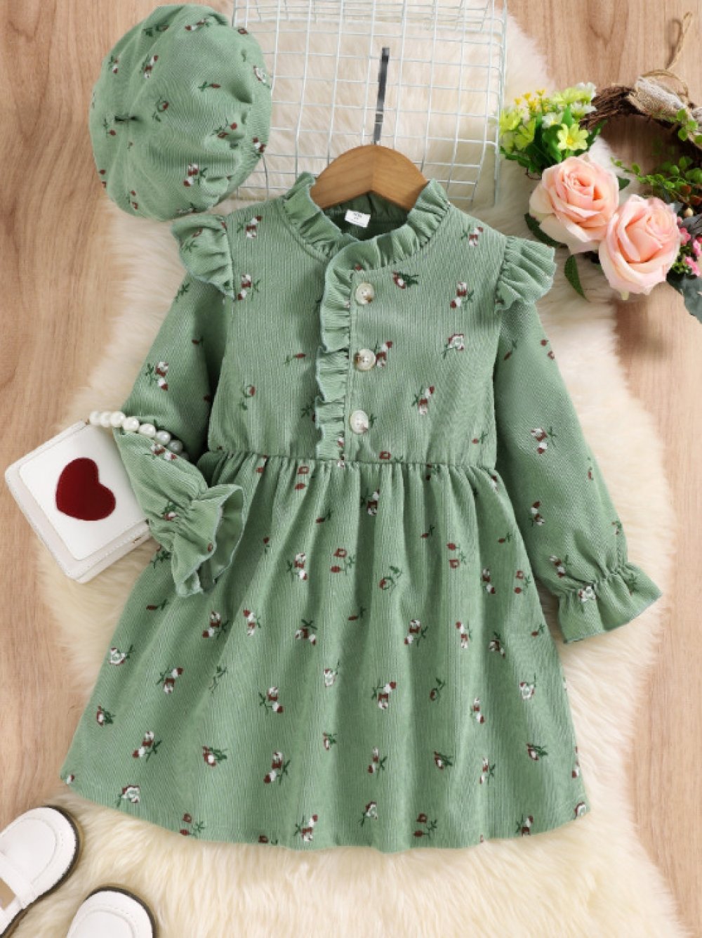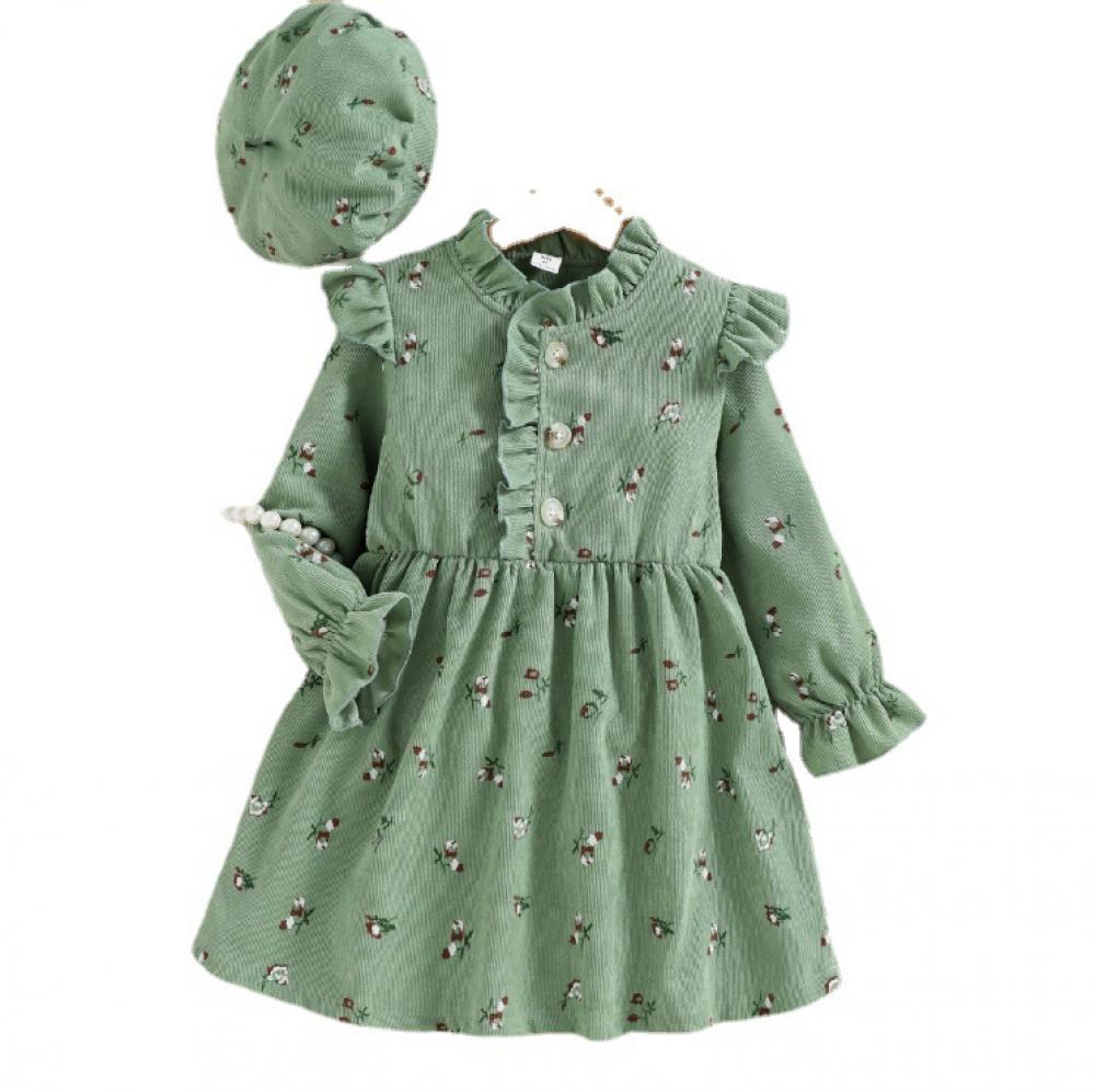 Autumn Toddler Girls Long-sleeve Floral Corduroy Dress + Hat Wholesale Girls Clothes