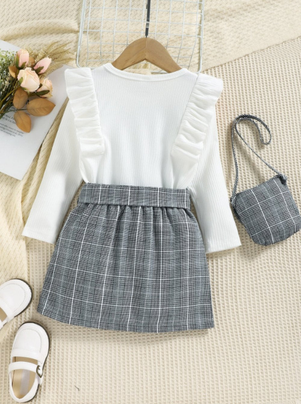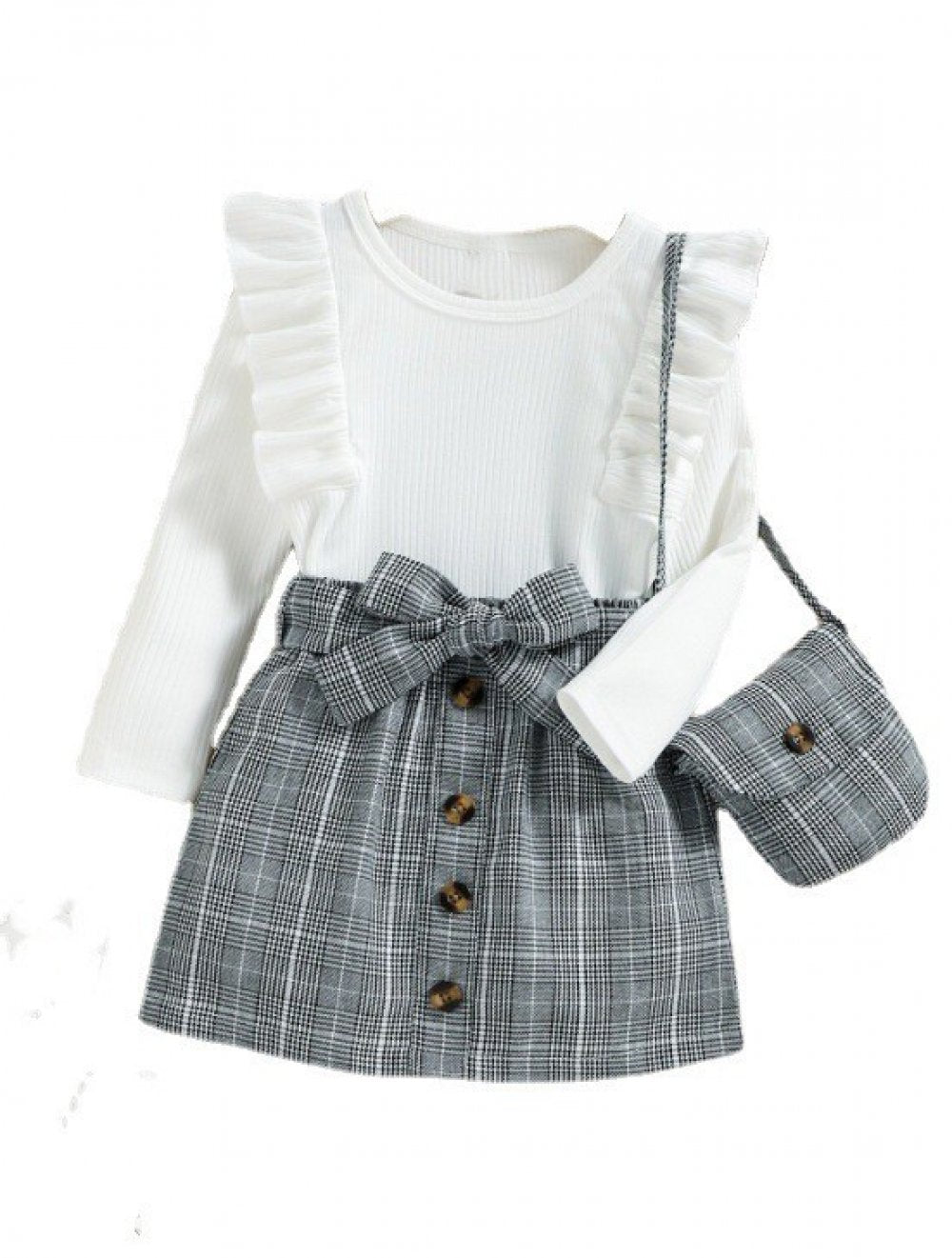 Autumn Toddler Girls Ruffled Sleeve Top + Plaid Skirt + Shoulder Bag Set Wholesale Girls Clothes