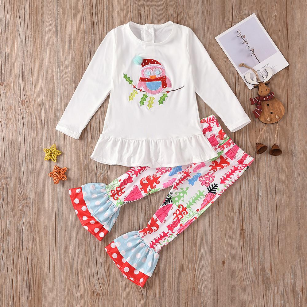 Autumn/Winter Christmas Owl Embroidered Christmas Tree Dot Flared Pants Two-Piece Girls Suit Wholesale