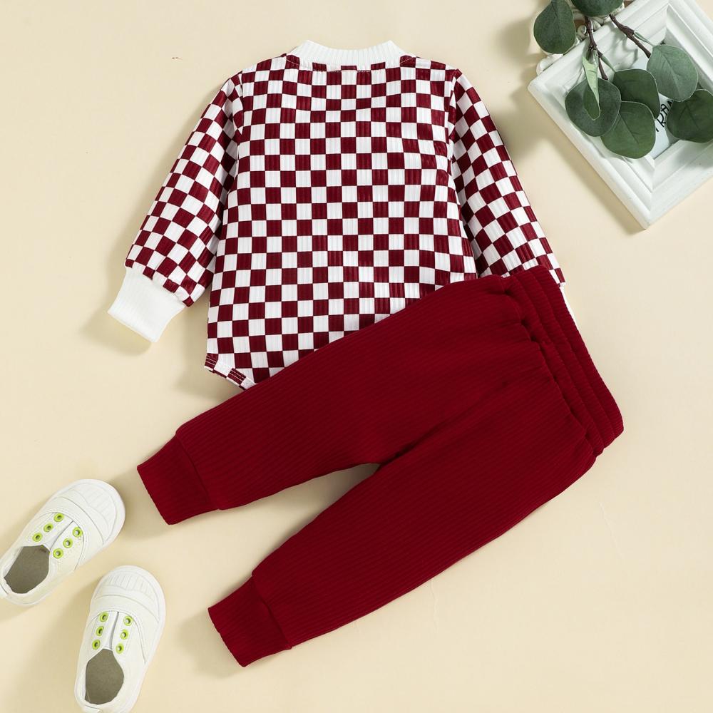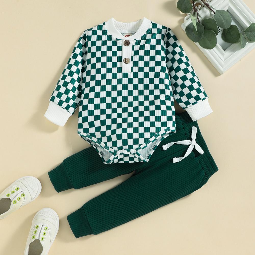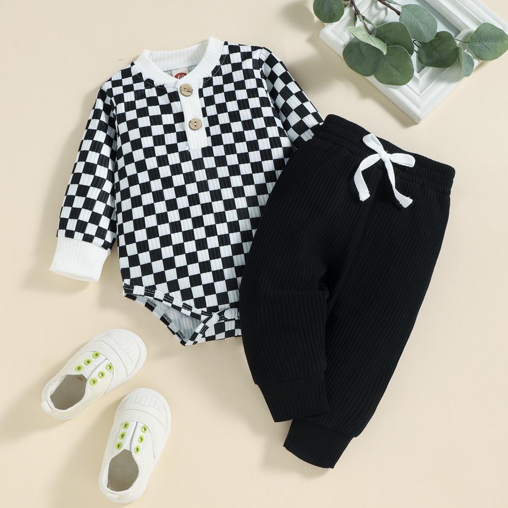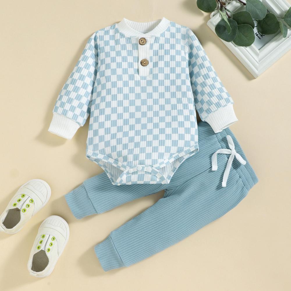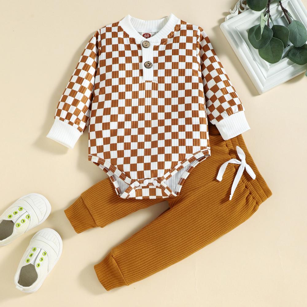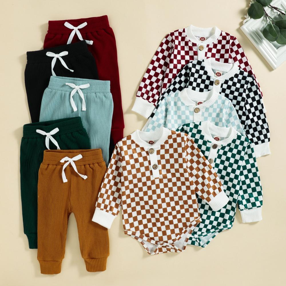 Autumn Winter Unisex Baby Checkerboard Pit Strip Romper + Pants Set Wholesale Baby Clothes