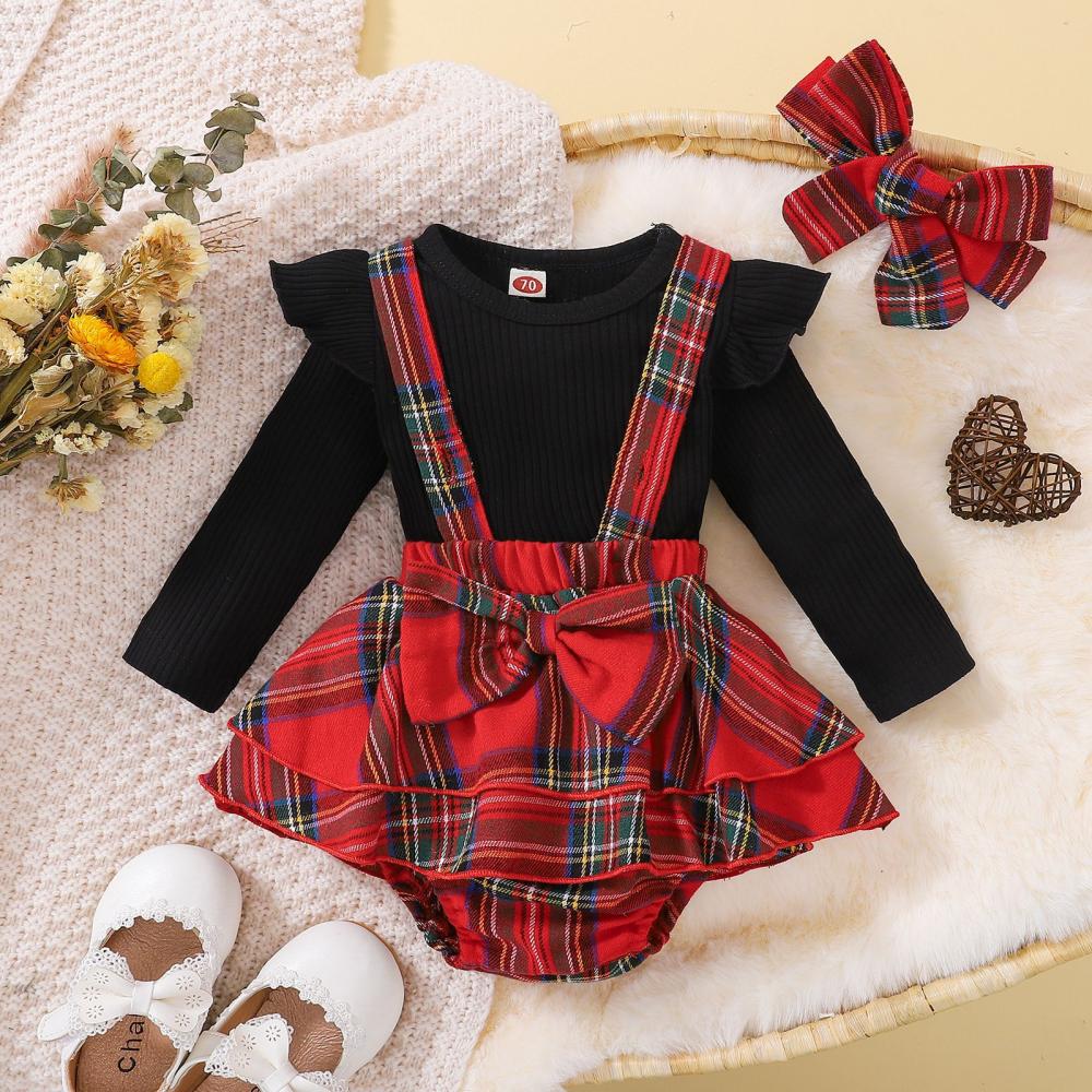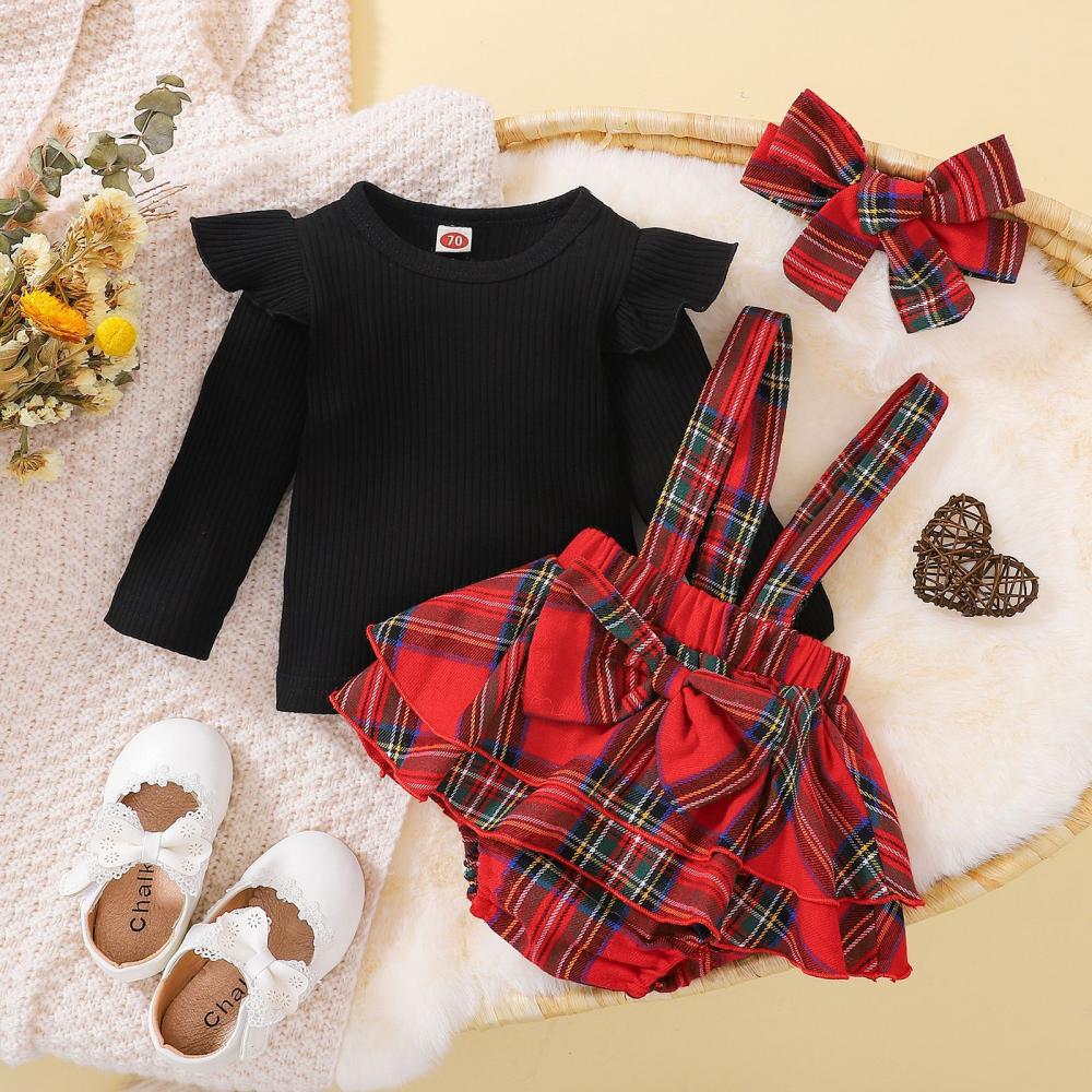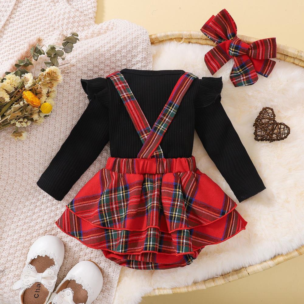 Baby Girl Christmas Cotton Pit Strip Pure Black Long Sleeve Top + Plaid Strap Romper Suit Wholesale