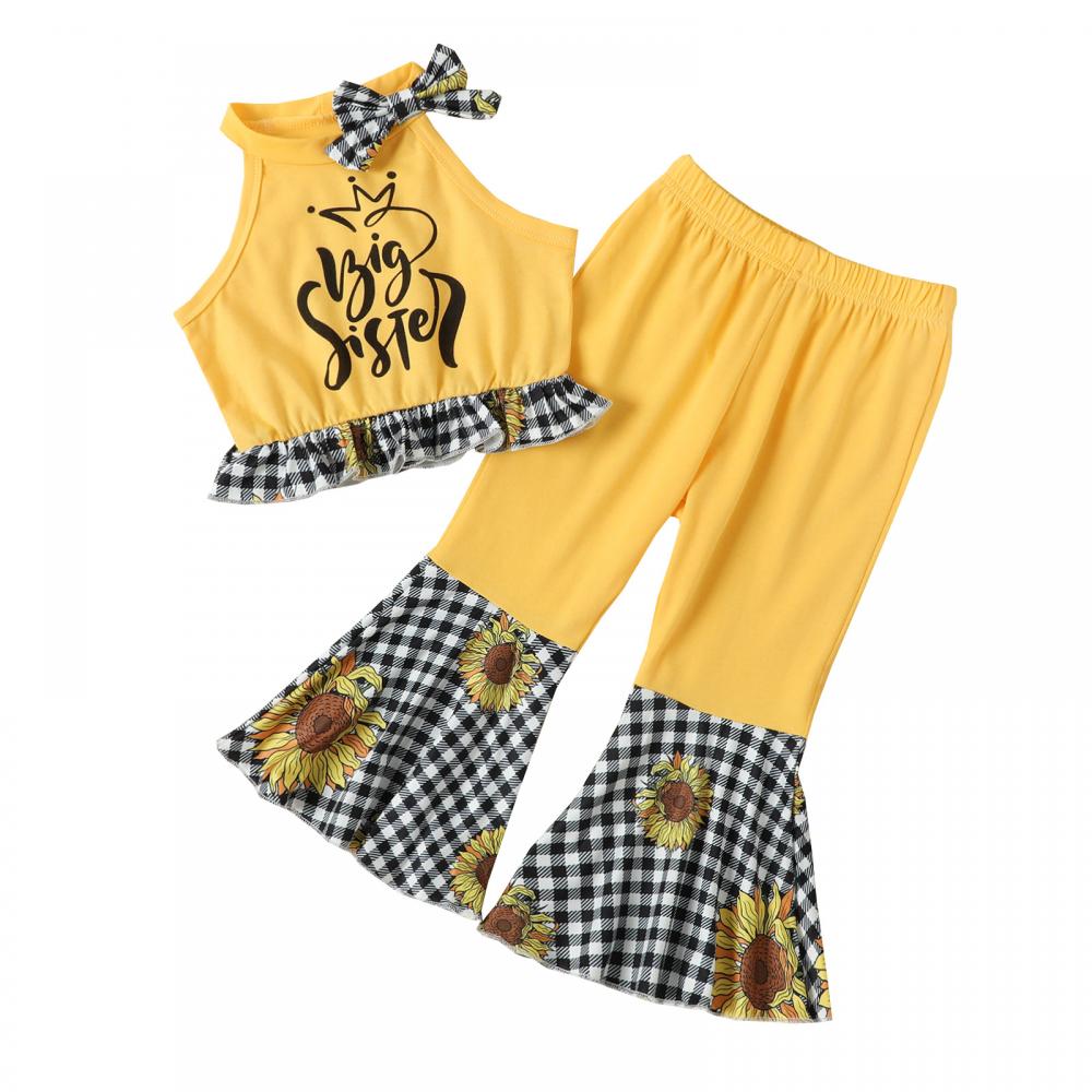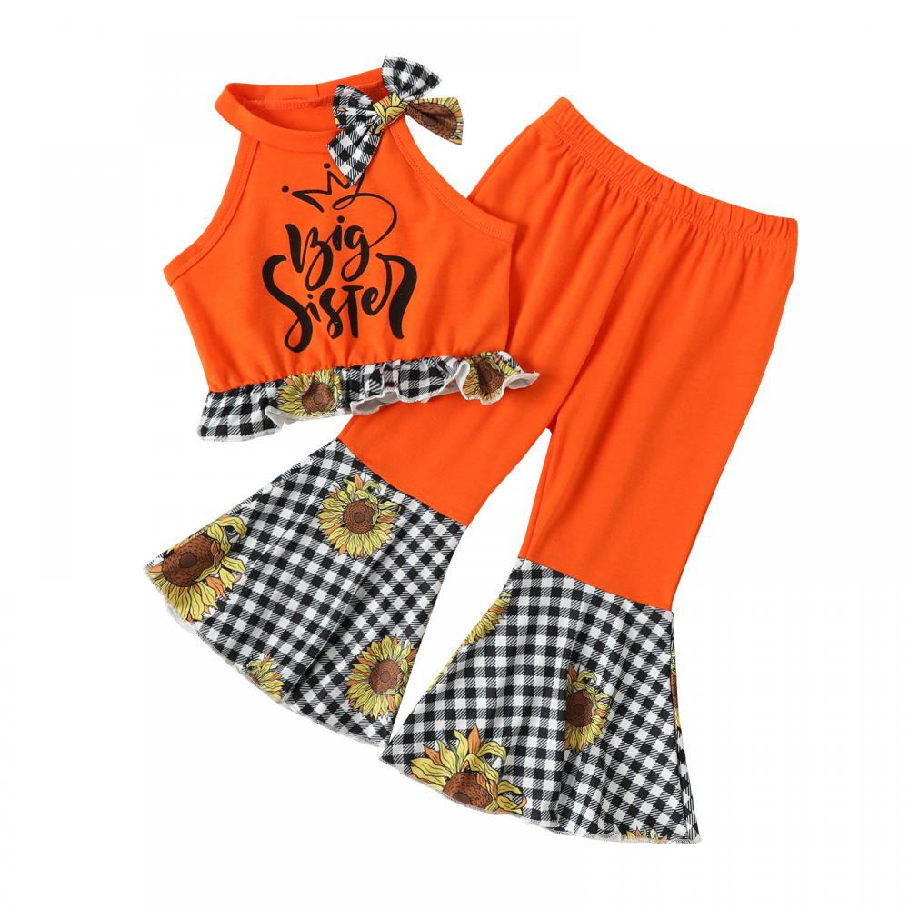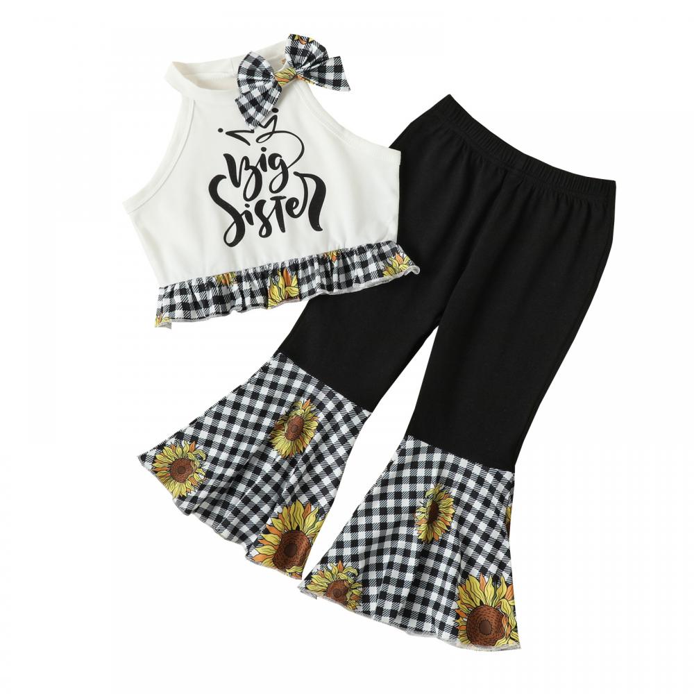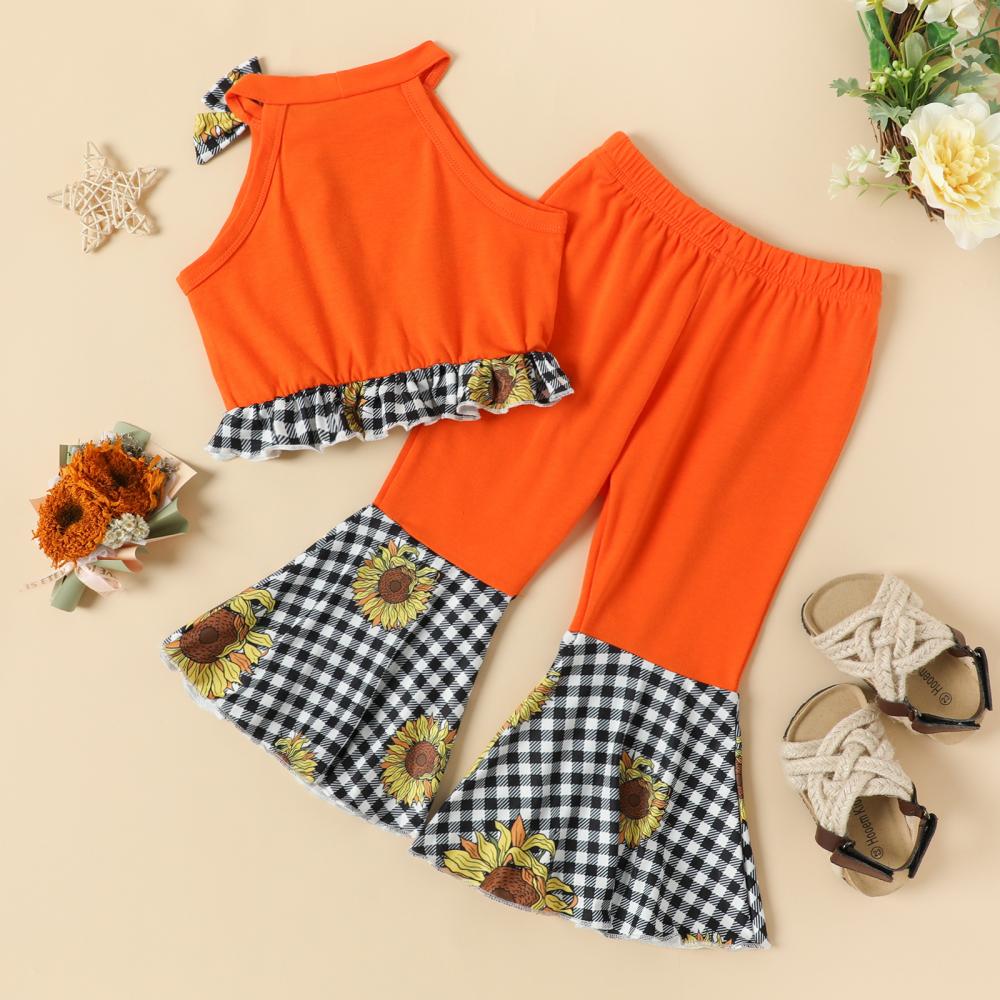 Children's Clothing Girls Sleeveless Halterneck Stitching Plaid Flared Trousers Suit Wholesale Girls Clothes