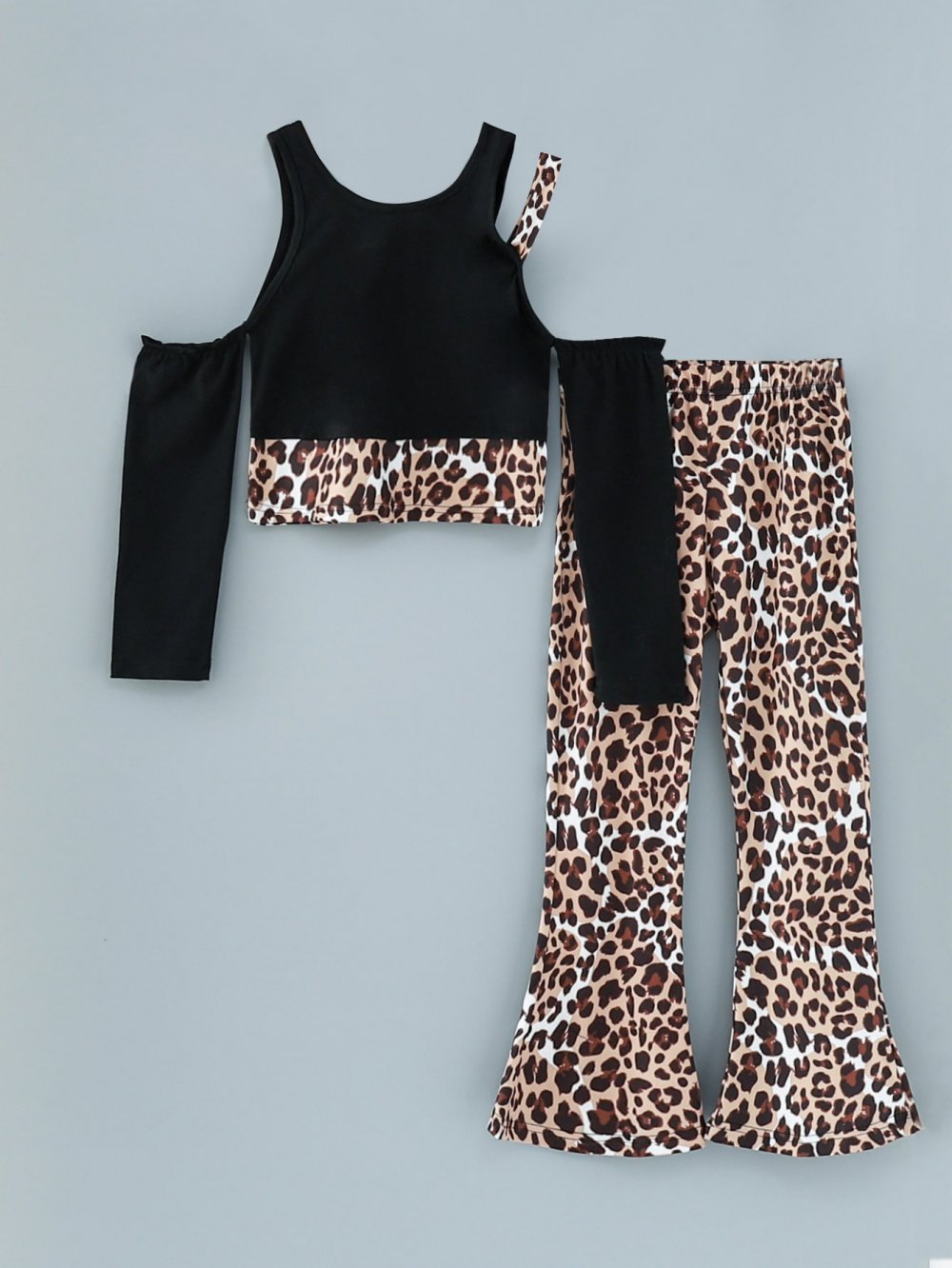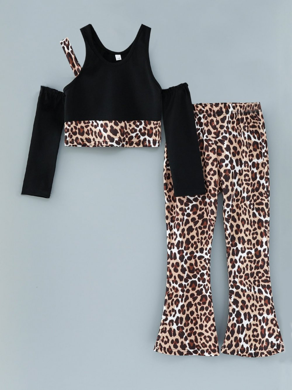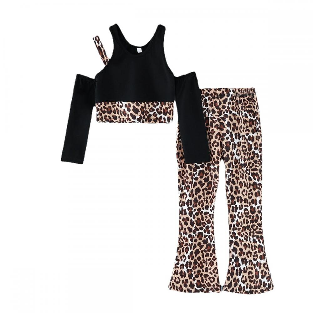Girls Spring and Autumn Off-the-shoulder Long-sleeved Top Leopard Print Flared Pants Suit Wholesale