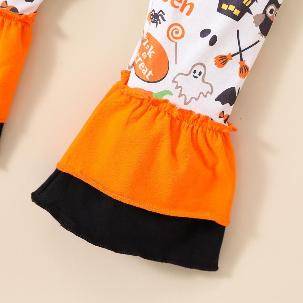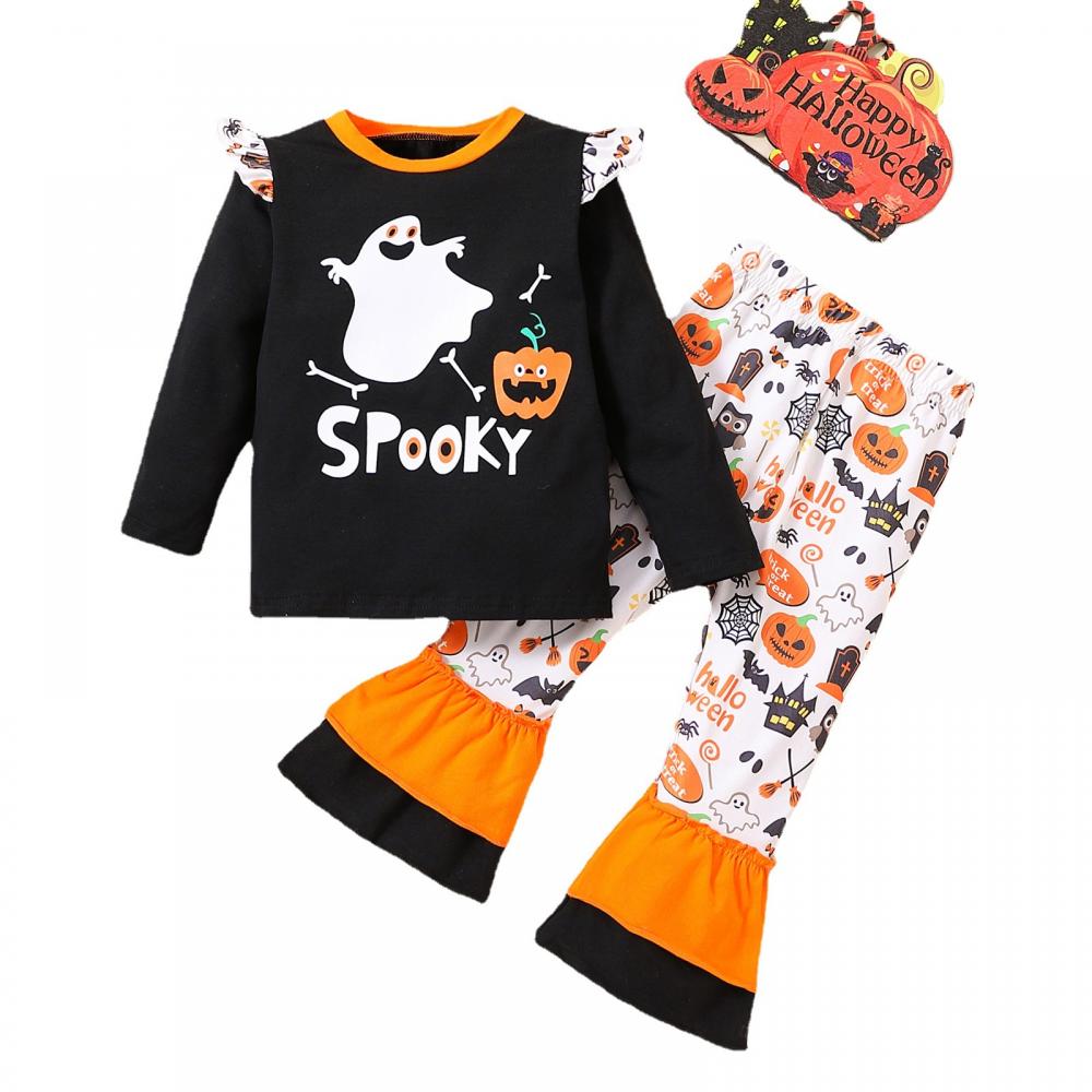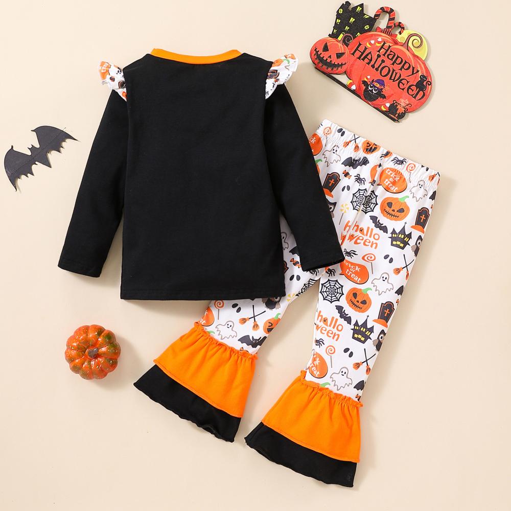 Halloween Spring Autumn Girls Pumpkin Long Sleeve Top Flared Pants Two Piece Set Wholesale Girls Clothes