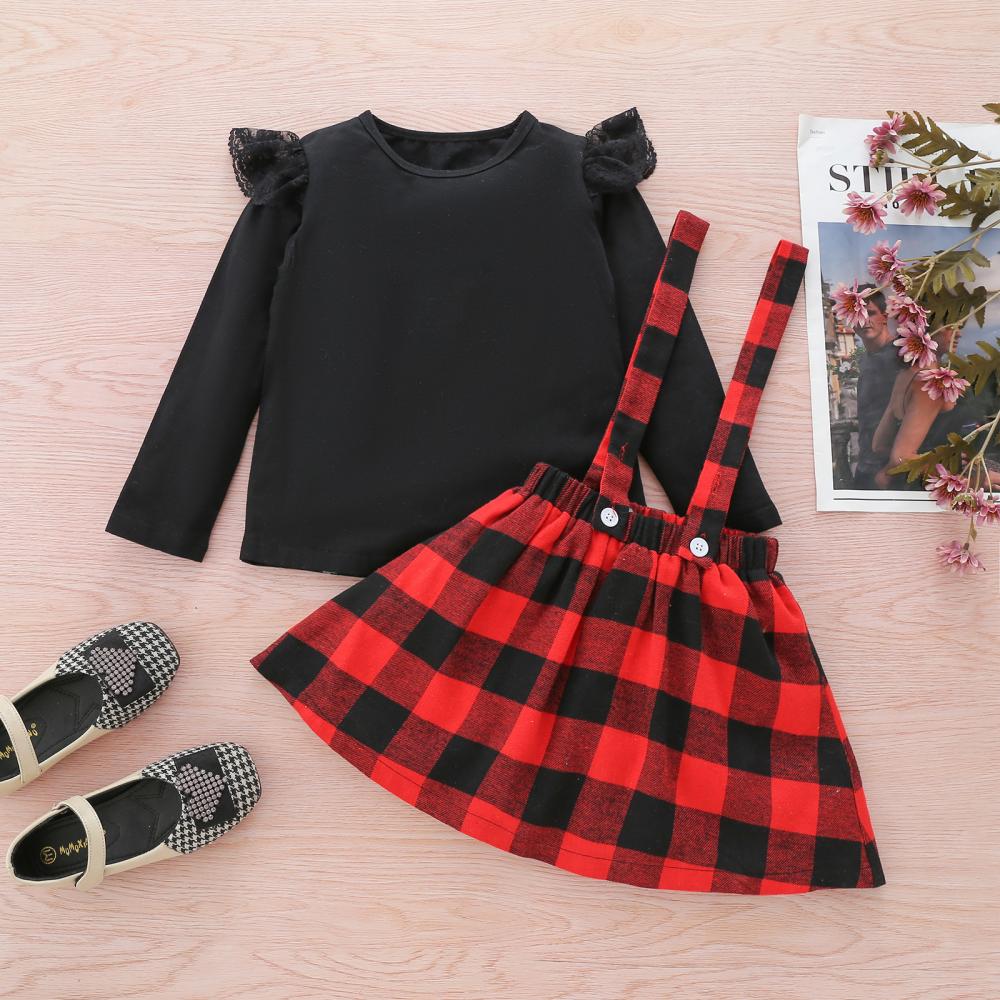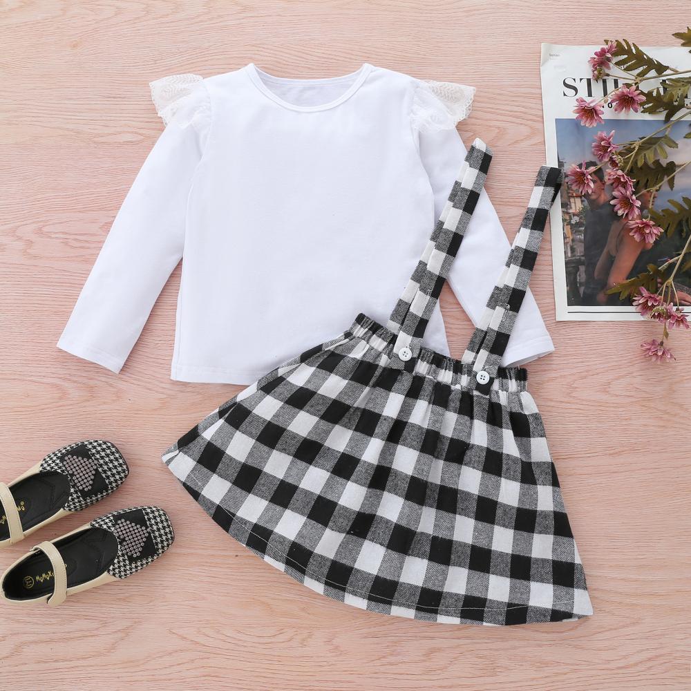 Spring and Autumn Toddler Girl Pure Flying Sleeve T-Shirt Plaid Skirt Suit Wholesale Girl Clothes