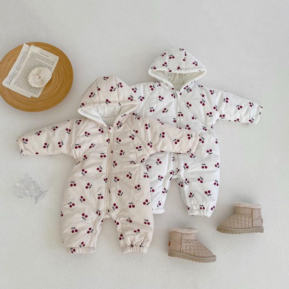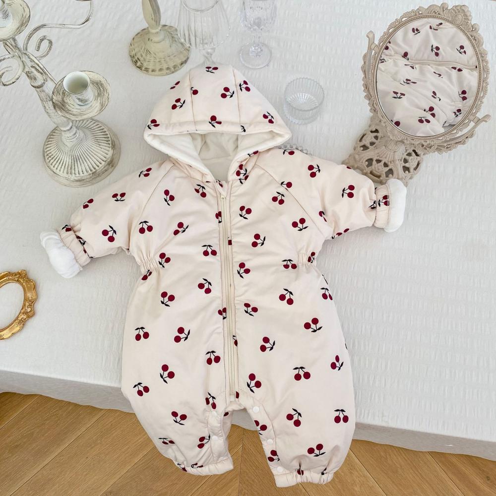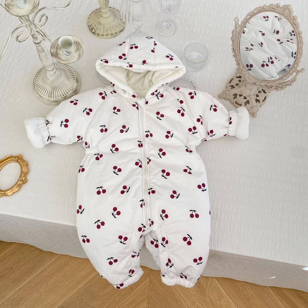 Winter Brushed and Thicken Cherry Print Quilted Hooded Romper Wholesale Baby Clothes